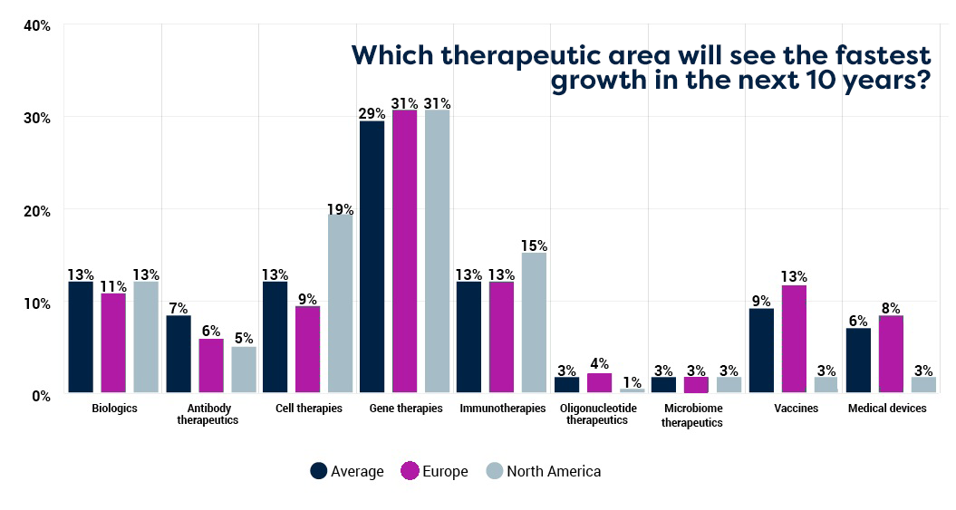 Respondents expect this boom in gene therapies to help drive a revolution in oncology treatment over the coming decade, with 27% predicting that the biggest advances in oncology will be gene therapies, followed by immunotherapies (25%) and cell therapies (21%).