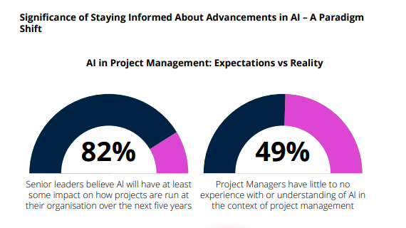 Why should Project Managers be informed about AI advancements in Project Management? According to a 2023 PMI Poll, 82% of senior leaders within Project Management believe AI will have substantial impact on their organisation in the next five years, while 49% have little to no experience or understanding of AI.