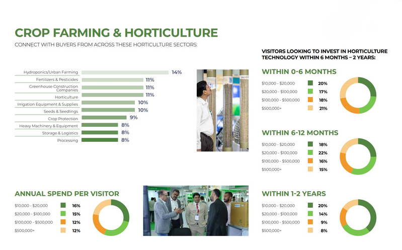 - 24% of visitors are investing between $100,000 - $500,000, targeting greenhouse construction, irrigation systems, controlled-environment farming, and crop optimisation technologies.