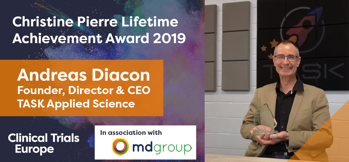 At this year's Clinical Trials Europe in Barcelona, the Christine Pierre Lifetime Achievement Award 2019 in association with mdgroup was presented to Andreas Diacon, Founder, Director and CEO at TASK Applied Science (pictured above).