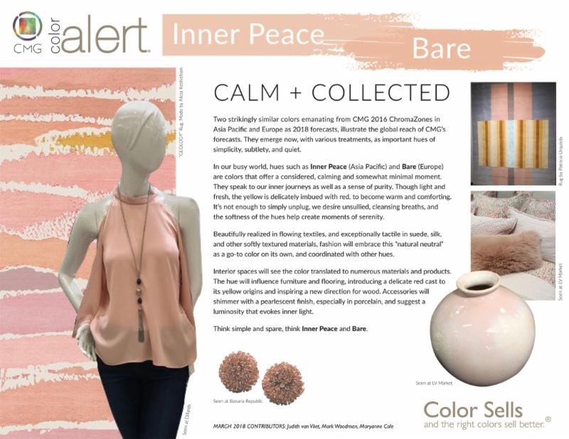In our busy world, hues such as Inner Peace (Asia Pacific) and Bare (Europe) are colors that offer a considered, calming, and somewhat minimal moment. They speak to our inner journeys as well as a sense of purity. Though light and fresh, the yellow is delicately imbued with red, to become warm and comforting. It's not enough to simply unplug, we desire unsullied, cleansing breaths, and the softness of the hues to help create moments of serenity.
