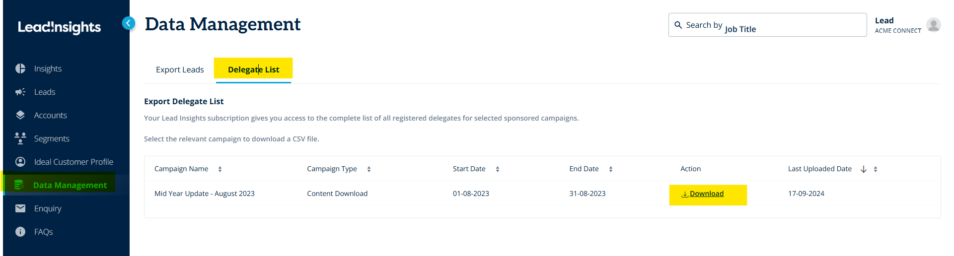 The Attendee List will be posted in your Lead Insights dashboard under "Data Management". This should be a downloadable file. (see photo below)
