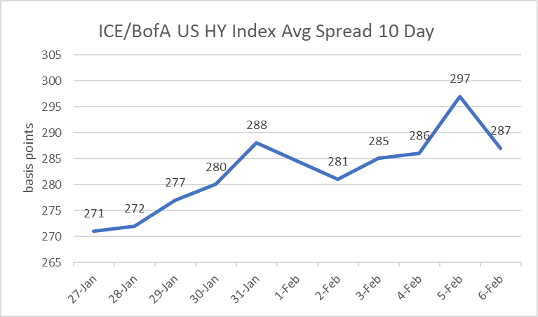 - High-Yield ICE/BofA index is higher today (2/06) by +0.168%. The average spread narrowed on 02/06 (- 10) basis points at 287. The BB sector spread narrowed (- 09) at 171 The B sector narrowed (- 11) at 312. The CCC sector was narrower (- 08) at 898.