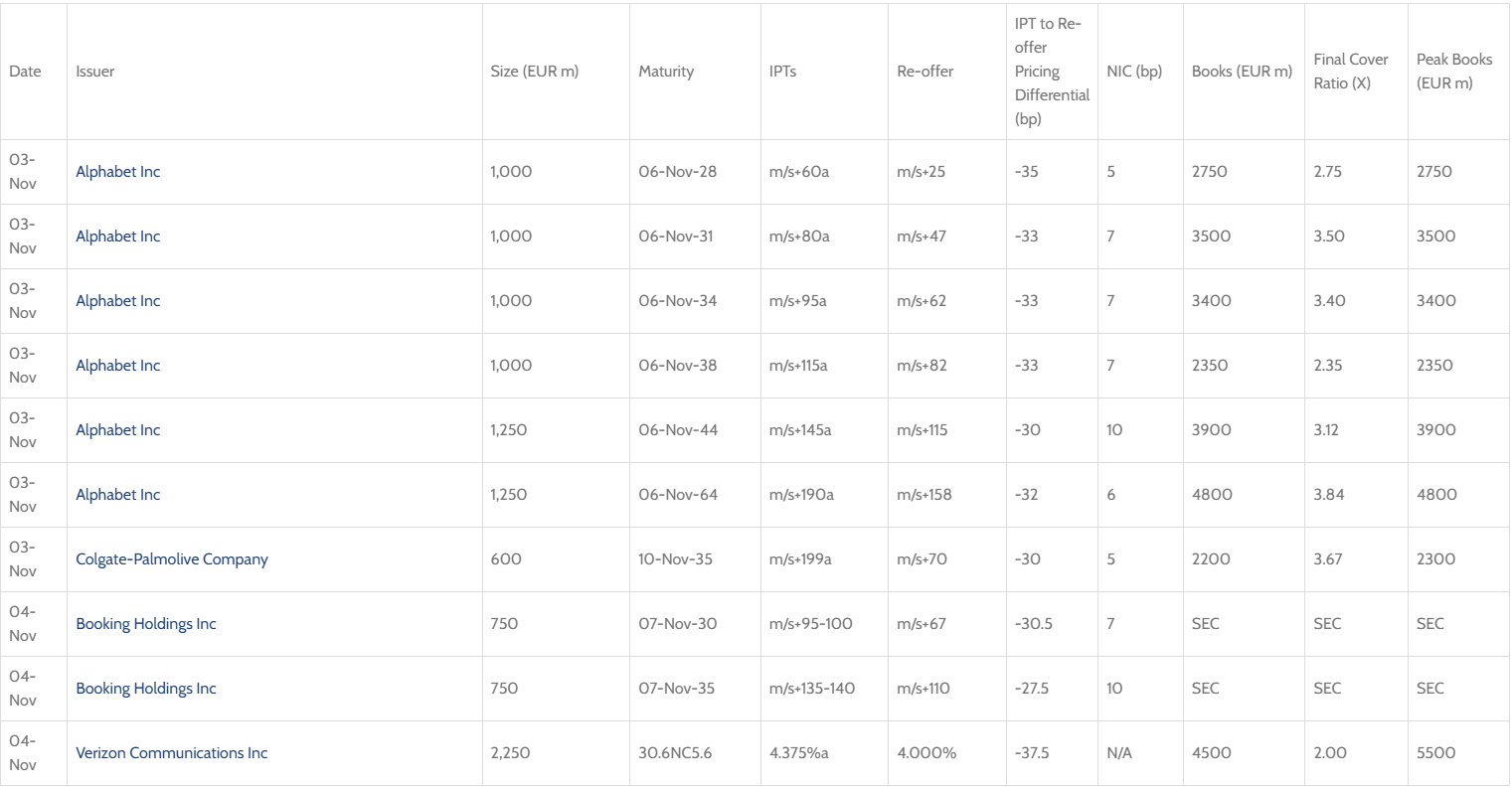 Verizon and Booking Holdings became the latest US issuers to tap the single currency European bond markets on Tuesday, backing up deals from Alphabet and Colgate-Palmolive at the start of the week. And Bristol-Myers Squibb, Dover Corp, NextEra Energy and PACCAR are all sat in what remains a bustling pipeline.