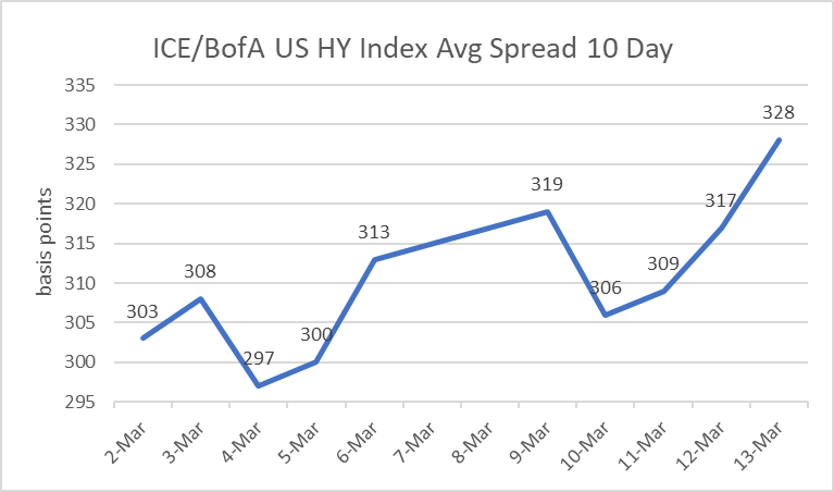- High-Yield ICE / BofA index is LOWER today (3/13) by 0.319%. The average spread was wider on 03/13 (+ 11) basis points at 328. The BB sector spread widened (+ 09) at 206, The B sector widened (+ 11) at 360. The CCC sector was wider by (+ 17) at 978.