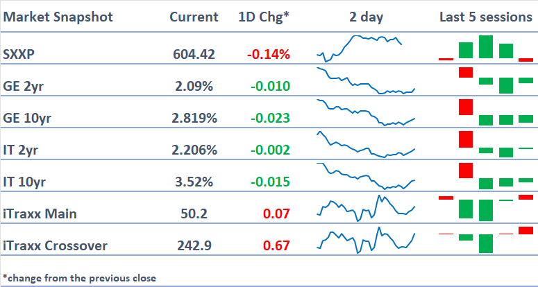 **Govvies: EGB yields lower across the market as curves flatten, although some of the morning moves given up. Biggest short-end yield drop came in SP (-1.7bp), long-end dopped the most in FR and GE (-3.9bp), which was 2-3bp off the morning’s lows at the long end. UKTs holding at -2.8bp/-7bp