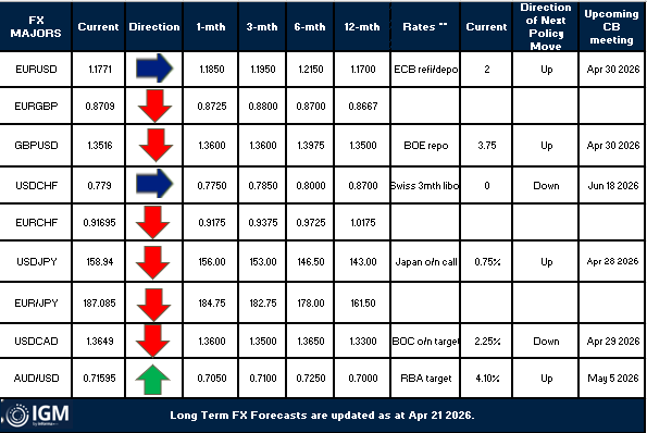 AUD/USD - The second best performer since the war started and through 2026 so far. With the Antipodeans viewed as relatively sheltered from the war and a decent chance of a third straight RBA rate hike in May further gains beyond current highs of 0.7222 could be in the offing. If this is accompanied by increased Fed rate cut expectations, big bulls could well target 0.75 over the forecast period, particularly as China growth beat expectations in Q1 at 5.0%. We are on amber alert to raise on a big 0.7200-plus break, but we're also relatively cautious on risk sentiment and the ongoing equities charge. Are pullbacks due?