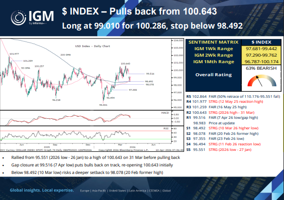 Appears to be OFF at the start of the week and the USD is broadly firmer, with the DXY USD Index, basing latterly at 98.53-54, which also coincides with the possible pivot of the 200-dma, as weekend peace talks between the US and Iran failed/collapsed.