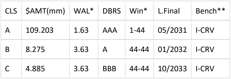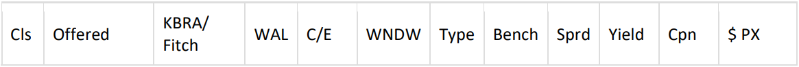 -- [Commercial Equipment Finance (CEFI) 2025-1] $122.363mm Equipment Lease ABS via KeyBanc. (No Grow) Pricing Timeline: Next week. Bill & Deliver: KeyBanc. First Pay Date: 11/17/25. Format: 144a/Reg S. Expected Ratings: DBRS. ERISA: Yes. Ticker: CEFI 2025-1. Min Denoms: $100k by $1k. This is a Rule 144A Private Placement Transaction.
