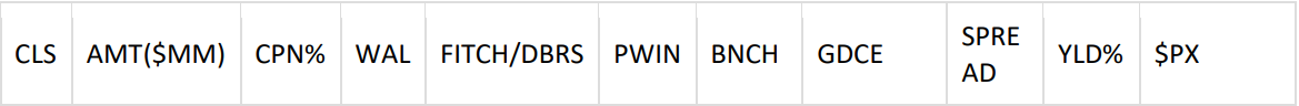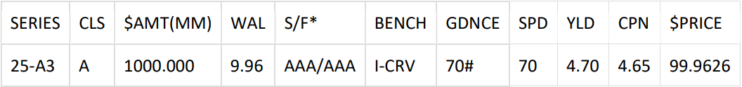 Several large autos kicked off premarketing following the conference. The largest, a $900million GM Financial Consumer Automobile Receivables Trust (GMCAR) 2025-4 prime Auto Loan ABS via WF(str)/BMO/CA/DB/JPM, was understood to be progressing well. As of Friday midday, the A2 Class showed 1.5x oversubscription at IPT of high 30s over benchmark, while the A3 Class had 95% IOI at IPT of mid 40s over benchmark. (For the full details, please see the ABS marketing section).