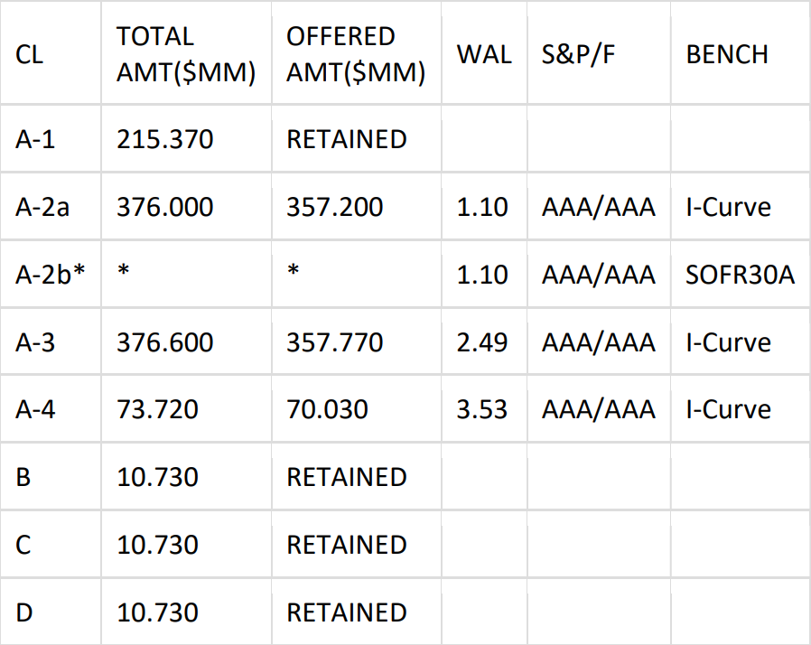 -- [Hyundai Capital Floorplan (HFMOT) 2025-1] $500mm Floorplan ABS via Barclays(str)/Lloyds/SG. Deal Size: $500mm (can grow up to $700mm). Expected Settle: November 5, 2025. Offering Format: 144A / Reg S. First Payment Date: December 15th, 2025. ERISA: Yes. Minimum Denominations: $100,000 x $1,000. Bloomberg Ticker: HFMOT 2025-1. B&D: Barclays. Hyundai Capital America (“HCA”) has mandated Barclays (structuring), Lloyds Securities, and Societe Generale as joint bookrunners on its upcoming $500mm Auto Floorplan ABS transaction, Hyundai Floorplan Master Owner Trust 2025-1 (“HFMOT 2025-1”). The transaction represents Hyundai's first floorplan issuance since 2019. Subject to market conditions, the leads expect to price the transaction next week.