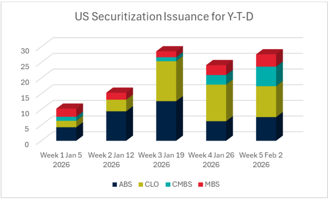 The first week of February wrapped up on a strong note with investors absorbing over $27 billion in new issuance. Among the standout US ABS deals were the $1.5 billion Ford Credit (FORDR) 2026-1 Auto ABS which was 50% upsized on investor demand and a Cologix Data Centers (CLGIX) 2026-1 / 2026-2 $1.35billion Data Centers ABS which priced under Rule 4(a)(2).