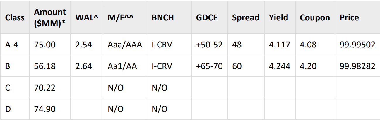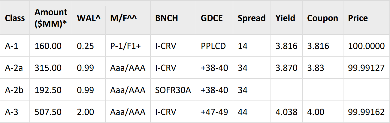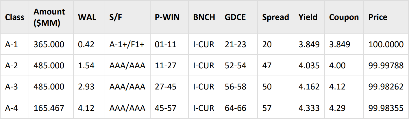 Additionally, the A-2 class 1-year WAL bonds priced well inside the FORDL 2025-B class A-2a/A2b bonds with a 1-year WAL, which priced 5 basis points wider at 39 basis points over the interpolated curve and SOFR back in July 2025.