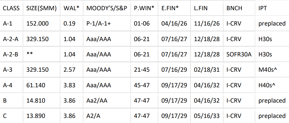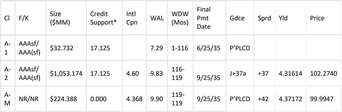 GM Financial has mandated Wells Fargo Securities (str), BMO Capital Markets, Credit Agricole Securities, Deutsche Bank Securities, and J.P. Morgan as Joint Bookrunners and BofA Securities, Citigroup, Great Pacific Securities, and Lloyds Securities as Co-Managers on an upcoming $900.14MM prime auto loan ABS transaction, GM Financial Consumer Automobile Receivables Trust 2025-4 (GMCAR 2025-4). Subject to market conditions, the leads expect to formally announce the transaction early next week.