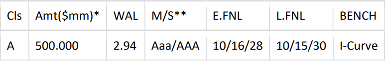 -- [Hyundai Capital Floorplan (HFMOT) 2025-1] $500mm Floorplan ABS via Barclays(str)/Lloyds/SG. Deal Size: $500mm (can grow up to $700mm). Expected Settle: November 5, 2025. Offering Format: 144A / Reg S. First Payment Date: December 15th, 2025. ERISA: Yes. Minimum Denominations: $100,000 x $1,000. Bloomberg Ticker: HFMOT 2025-1. B&D: Barclays. Hyundai Capital America (“HCA”) has mandated Barclays (structuring), Lloyds Securities, and Societe Generale as joint bookrunners on its upcoming $500mm Auto Floorplan ABS transaction, Hyundai Floorplan Master Owner Trust 2025-1 (“HFMOT 2025-1”). The transaction represents Hyundai's first floorplan issuance since 2019. Subject to market conditions, the leads expect to price the transaction next week.