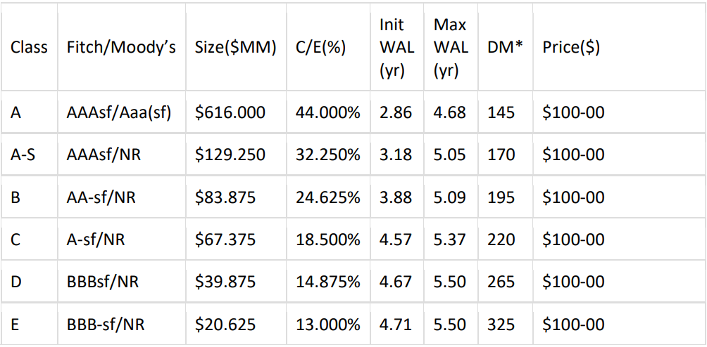 Easy Street Capital has mandated ATLAS SP as Sole Bookrunner & Structuring Agent, and Piper Sandler as CoManager on its upcoming $175MM issuance Residential Transition Loans. The Investor Tape and Investor Presentation have been made available via DealRoadshow). Subject to market conditions, the lead expects to price early next week.