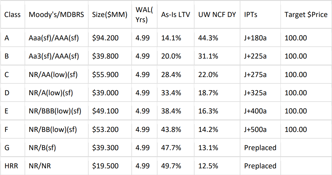 Collateral Summary: Aggregate Collateral Interest Cut-off Date Balance $1,100,000,000. Number of Collateral Interests / Mortgaged Properties 21 / 45. WA Collateral Interest Cut-off Date As-Is LTV Ratio 67.6%. WA Committed Commercial Real Estate Loan Stabilized LTV Ratio 65.8%. WA UW NCF DSCR 1.07x. WA UW Stabilized NCF DSCR 1.27x. WA UW NOI Debt Yield 5.6%. WA UW Stabilized NOI Debt Yield 8.9%. WA Remaining Term to Initial Maturity (months) 29. WA Remaining Term to Fully Extended Maturity (months) 49. WA Seasoning (months) 11. WA Remaining Call Protection (months) 5.9. WA Collateral Interest Gross Margin 3.1228%. Top 3 States: TX (20.2%); CA (15.9%); OH (10.6%). Top 5 Property Types: MF (61.4%), IND (23.1%), SS (6.1%), HOSP(5.8%), OFF (3.6%).