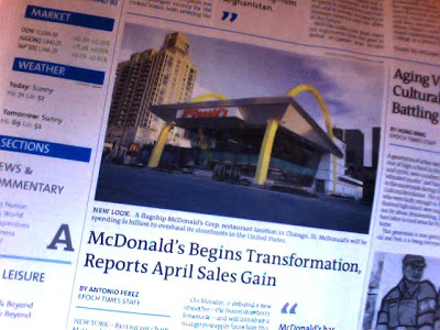 On my way into work this morning I saw a headline on "The Epoch Times" (a free paper that is handed out to pedestrians on the street in New York City). What caught my eye was a story about McDonald's re-inventing its brand. There was a picture of the flagship McDonald's which was right down the street from us at FUSE in Chicago. McDonald's is apparently spending $1 billion dollars to re-create its image in an attempt to distance itself away from competitors such as Wendy's and Burger King. It now has its eyes on more "upscale" markets like Panera Bread and Cosi. The article then goes on to tell us that David Palmer of UBS Securities calls this a potential "game-changer" for the chain. McDonald's is also serving new foods such as gourmet coffee, fruit beverages and oatmeal. I'm wondering if this will take or not. It seems to be a drastic move.