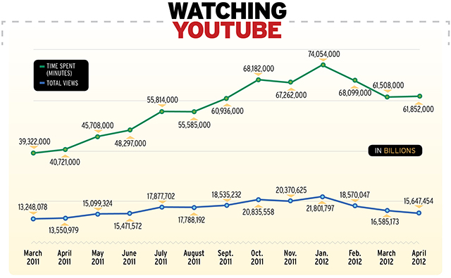 In the graph above, shown on AdAge Digital we find that YouTube views are falling. But how can this be? After all "60 hours of video are uploaded every minute." Well, it looks like in an effort to monetize the service further, YouTube is becoming more channel driven and changing it's metrics away from views. "On March 15, YouTube altered its recommendation system to make the time spent with a video or channel a stronger indicator than a click in determining which videos to surface to a user," says Ad Age. It's no competition for Hulu yet in terms of long-form viewing, but perhaps HBO's decision to air their new programs on YouTube could be a foreshadowing of growth in this area.