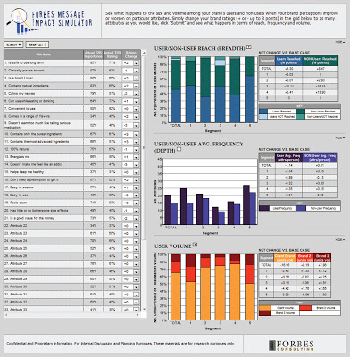 Developing optimal communications is a challenging topic that we at Forbes Consulting pursue relentlessly. Think for a moment ' what if you could predict the market impact of communicating specific brand benefits or positioning elements and choose between them for optimal market impact? The Forbes Message Impact Simulator allows you to do just that. It allows you to experiment with levels of prominence of a single benefit, or with various combinations of benefits ' and observe the effect on your brand's appeal and resulting estimated brand volume.