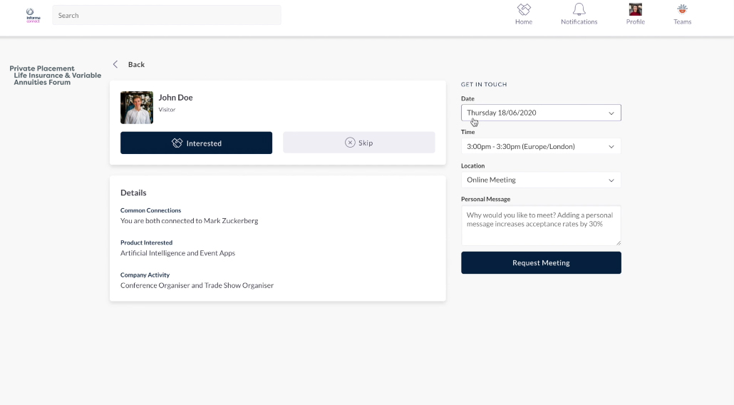 During the event, you can use the networking part of the platform to arrange and hold meetings with the people who matter to you, at a time that works best for both you.
