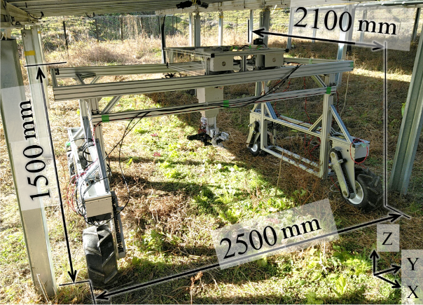 “The system also utilizes a 360-degree camera to recognize and manoeuvre its surroundings,” said Otani. “In addition, it is loaded with various farming tools – anchors (for punching holes), pruning scissors and harvesting setups. The robot adjusts its position using the robotic arm and an orthogonal axes table that can move horizontally.”
