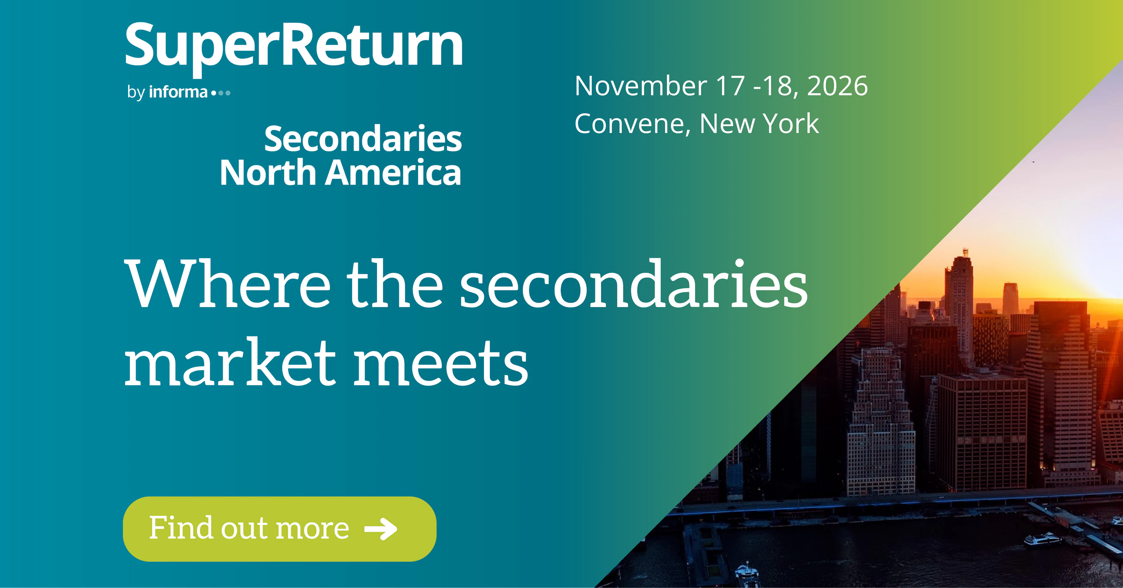 SuperReturn Secondaries North America 2026 is an unmatched event bringing together the North American secondaries community. This year taking place at Convene, New York, November 17-18.
