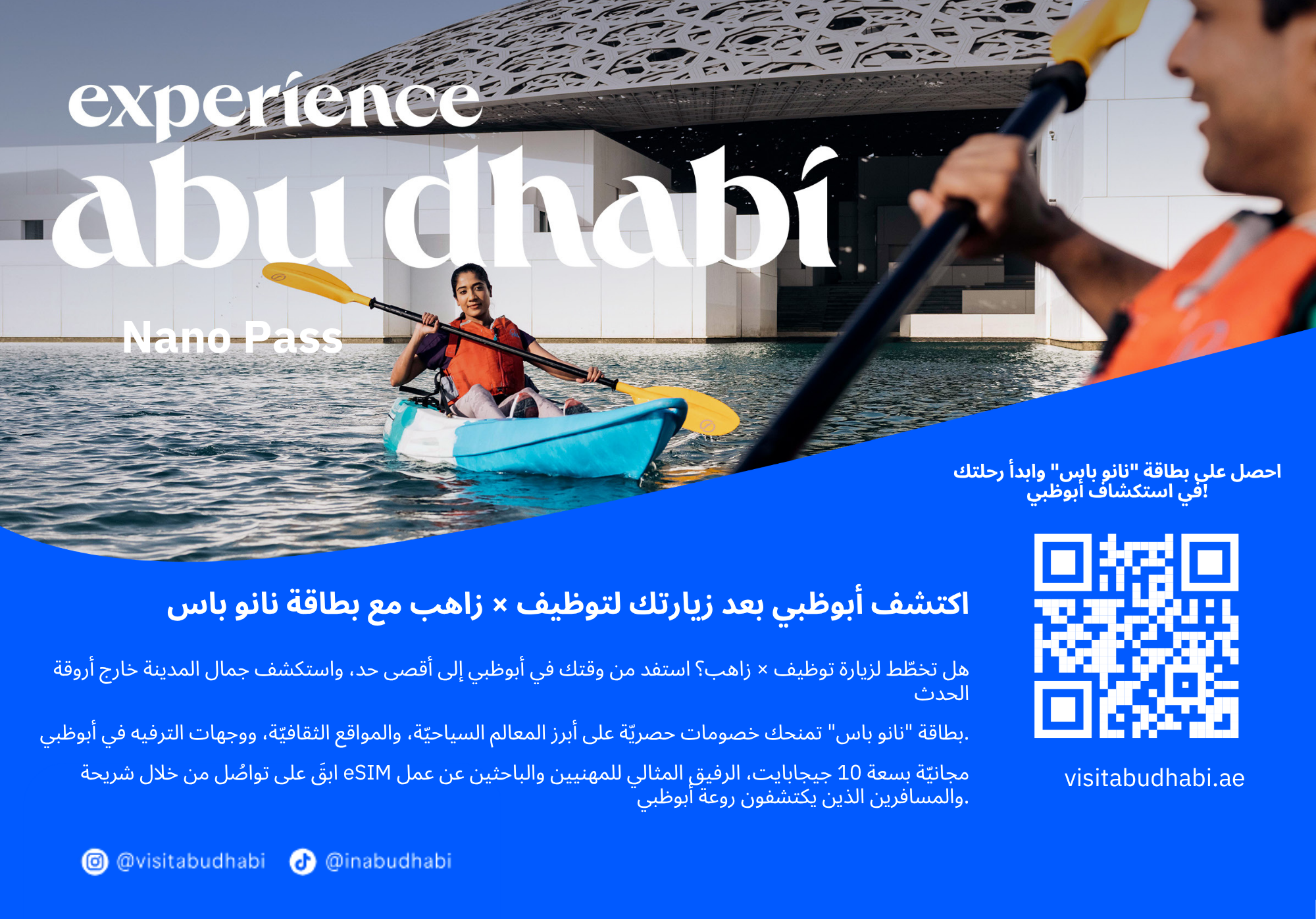 هل ستحضر معرض توظيف × زاهب؟ اغتنِم الفرصة لاستكشاف أبوظبي خارج أروقة المعرض. تمنحك بطاقة "نانو باس" خصومات حصريّة على أبرز المعالم والأنشطة الثقافيّة والترفيهيّة في أبوظبي. احصَل على شريحة eSIM مجانيّة بسعة 10 جيجابايت، مثاليّة للطلبة والأساتذة والمسافرين أثناء اكتشافهم للعاصمة.
