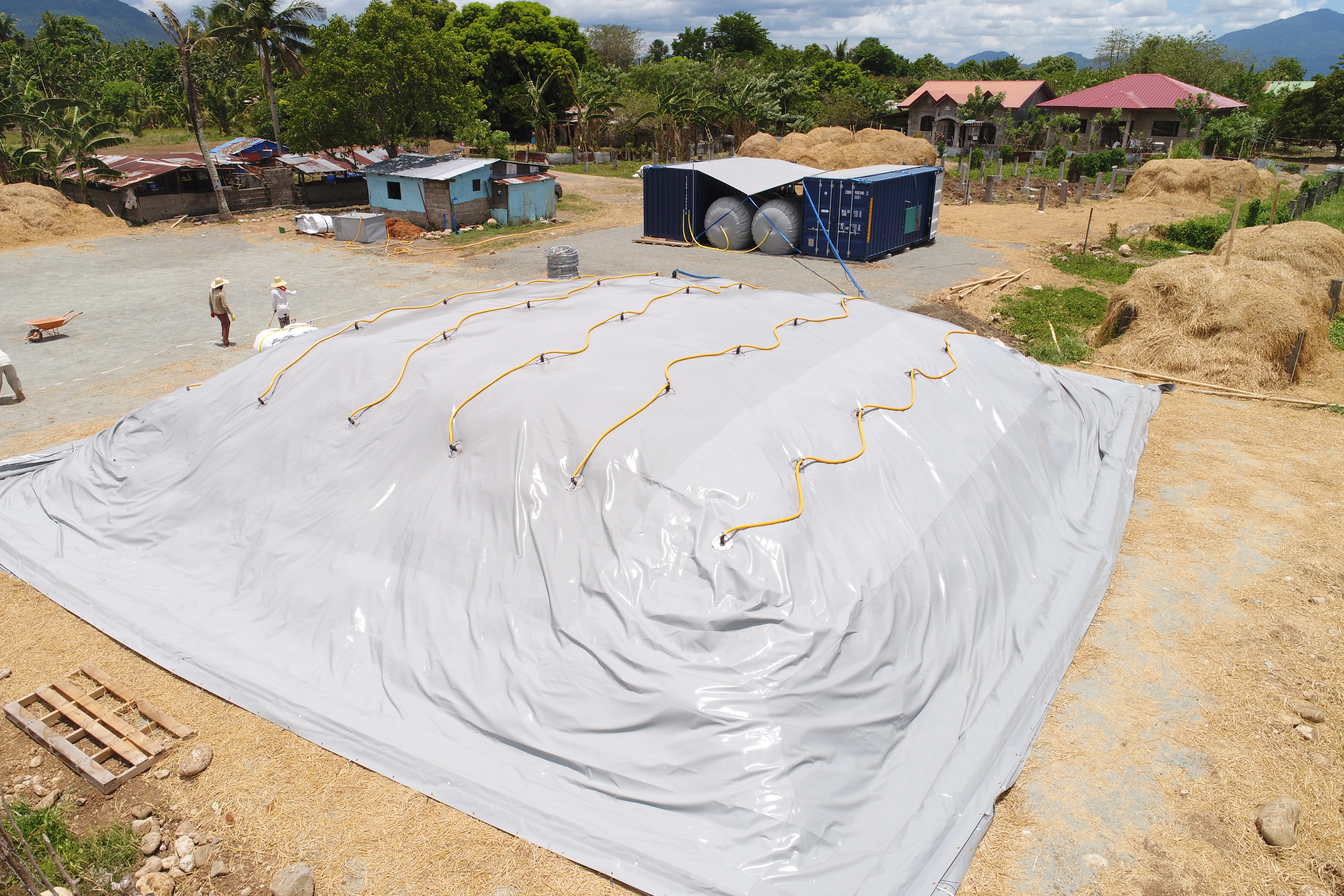 Header image shows the dryQUBE being trialed in the Philippines to produce biogas from rice straw.