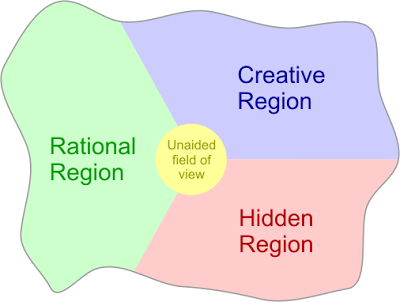 One very simple visualisation which has come out of this research is shown in the diagram above. It shows the space of all possible ideas for solving a problem, which is divided into three search regions: Rational, Creative and Hidden.