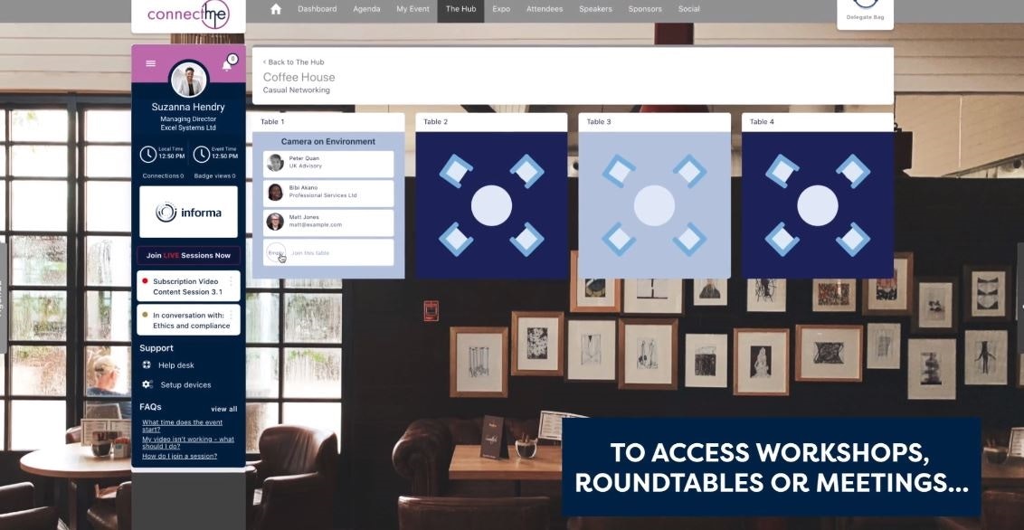 Click to sit on a table with a theme that suit your interests, or just next to delegates you'd like to connect with. When you sit on a table, you will enter a private video call with the others around your table.