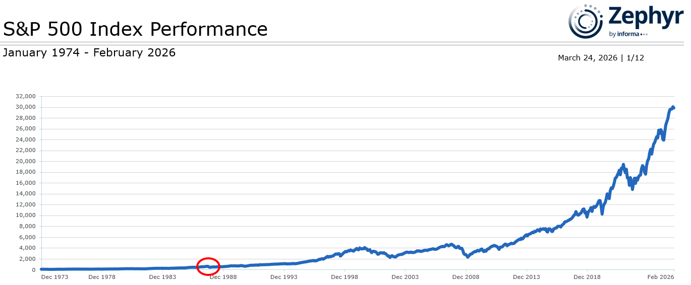 Take a look at the typical “Growth of $100 Graph” (figure 1). This chart of the S&P 500 index accurately displays overall performance, but it fails to indicate manager drawdowns. Most would focus on the dot com crash of the early 2000s, the Great Financial Crisis or the more-recent pandemic lockdown. It fails to accurately depict other periods of loss years ago. For example, the 1987 market crash doesn’t look too damaging here— but it was.