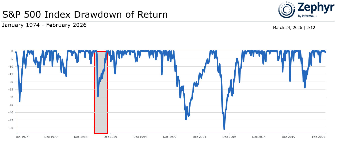 In figure 2, the drawdown graph brings all peak-to-trough losses to scale, and provides a good visual of the depth, duration, and frequency of all losses. It paints a different picture of the 1987 crash; the S&P 500 index lost nearly 30 percent and took almost two years to recover, hardly insignificant.