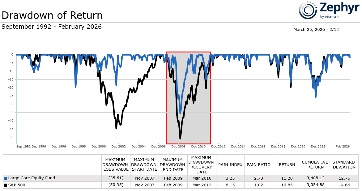 Figure 3 includes a large core mutual fund, which is represented by the blue line. Focusing on the Great Financial Crisis, the S&P 500 index (black line) lost 51 percent from its peak and took over three years to recover after it hit bottom. During that same period, the Large Core Equity fund limited its losses to under 36 percent. By losing less, Large Core Equity was able to preserve more of its capital, providing it with more money to participate in the recovery and regroup in less time than the benchmark (13 months vs. 37 months).