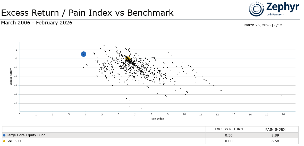 An excellent way to utilize the Pain Index is to compare it to a manager’s excess returns. Figure 4 compares Large Core Equity’s excess return vs. the S&P 500 index (Y-axis) and Pain Index (X-axis) against all the managers that make up the Morningstar Large Blend Universe.